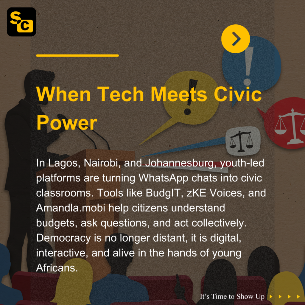 Young Africans are reshaping civic participation through simple but powerful tools. They are using technology to understand how their countries work, to ask informed questions, and to join conversations that once felt distant. A recent civic tech challenge drew over 250 youth-led applications from 30 countries, signalling a strong appetite for reshaping governance through digital tools. Platforms such as zKE Voices in Kenya are helping young people make sense of political systems and public finance in clear, accessible ways. In South Africa, Amandla.mobi is creating space for citizens to act collectively on political and social issues, and in Nigeria, BudgIT is simplifying public finance and civic information so that everyone can participate with clarity. Yiaga Africa continues to nurture political inclusion, leadership, and election integrity.